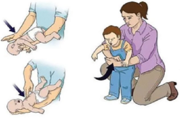 Constatando isso, o bebê deve ver apoiado de bruços sobre o antebraço, com a cabeça mais baixa que o corpo. Em seguida, dar cinco pancadas firmes nas costas, entre as escápulas; virar o bebê de barriga para cima e fazer cinco compressões torácicas no centro do peito, com a base da palma da mão.