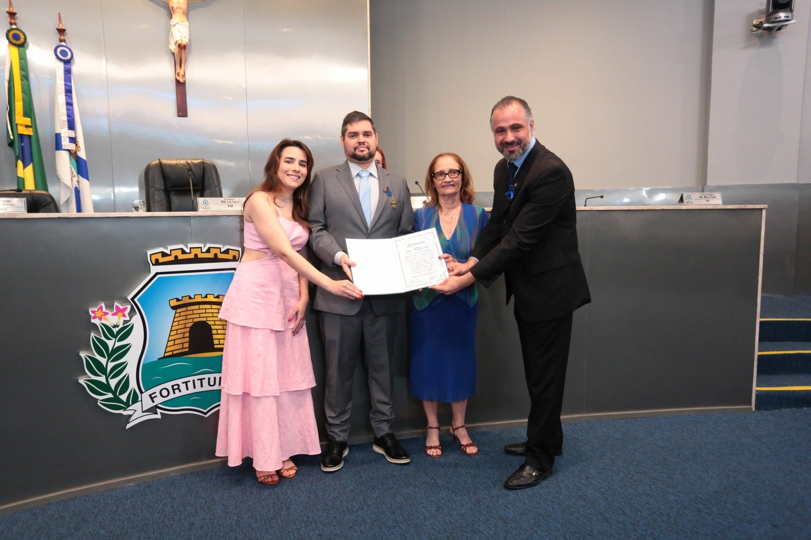 Presidida pelo vereador Luciano Girão (PDT) , a mesa dos trabalhos foi composta pela secretária municipal da Saúde, Riane Azevedo; Esther Falcão, coordenadora do serviço de diagnóstico por imagem do Instituto Dr. José Frota (IJF), e o homenageado, Ismar Vilanova.