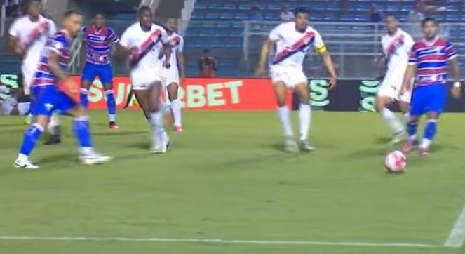 O Fortaleza teve um jogador a mais em campo, desde o fim do primeiro tempo, após o zagueiro Bruno acertar o rosto de Lucas Sacha, ao tentar afastar uma bola.