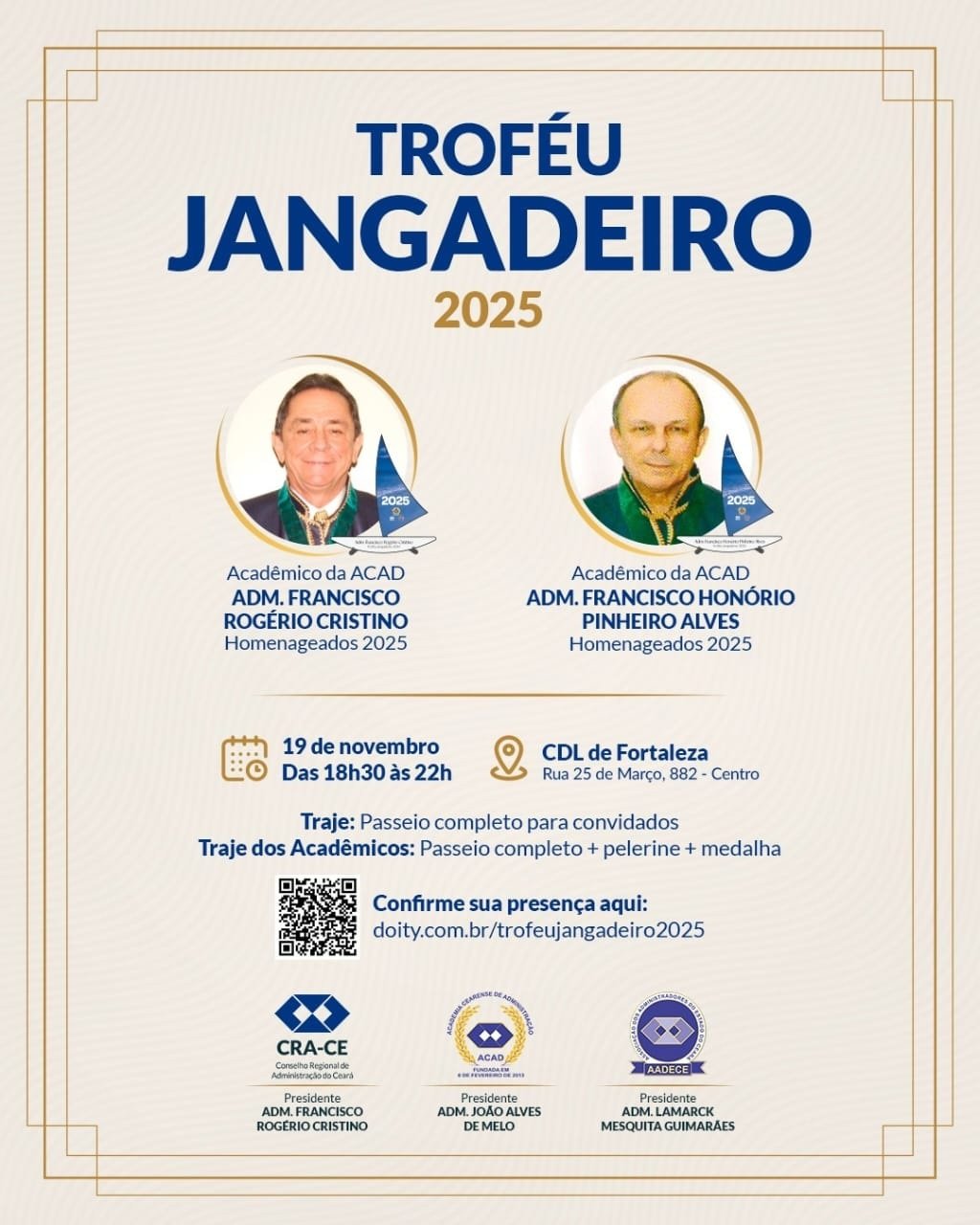 O Conselho Regional de Administração do Ceará (CRA-CE), a Academia Cearense de Administração (ACAD) e a Associação dos Administradores e Empreendedores do Estado do Ceará (AADECE) realizam, nesta quarta-feira, a partir das 18h30min, na sede da CDL Fortaleza, a entrega do Troféu Jangadeiro.