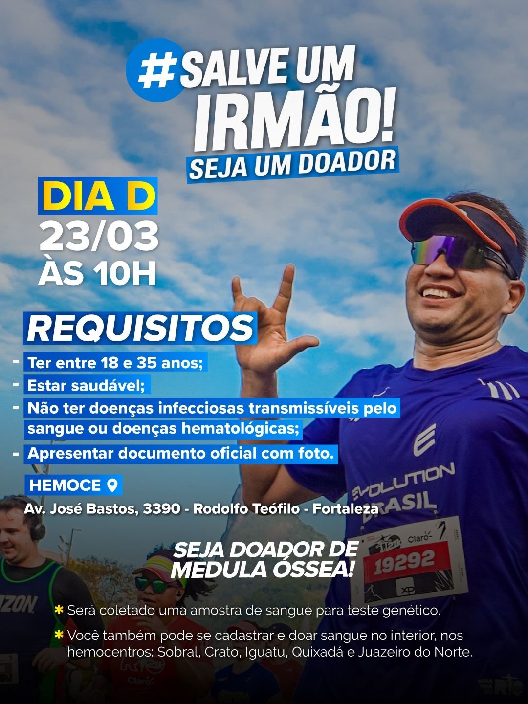 O Dia D da campanha #SalveUmIrmão será realizada na manhã do dia 23, a partir das 10 horas, na sede do Hemoce.