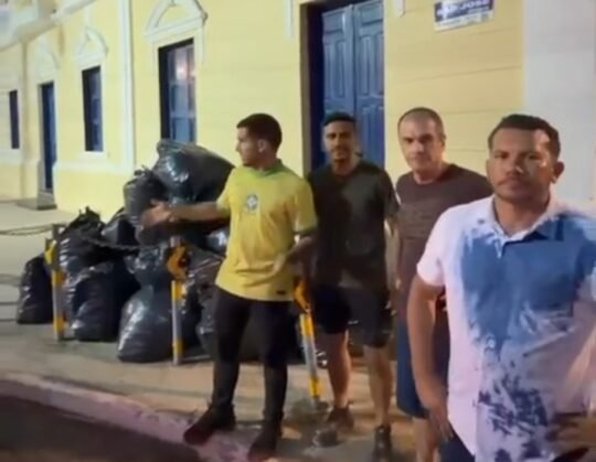 André Fernandes joga sacos de lixo na porta de Prefeitura. Foto: Reprodução Blogdoeliomar