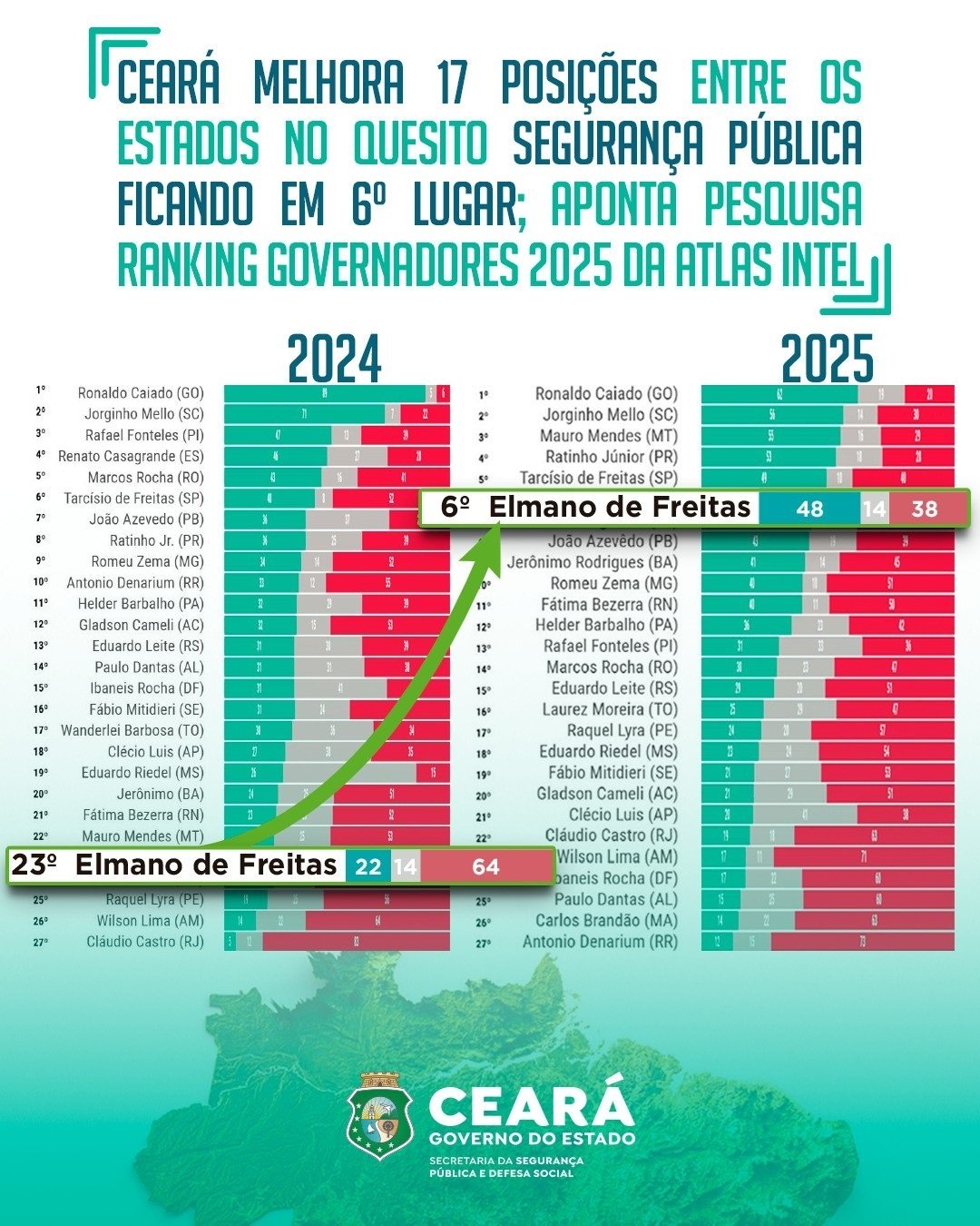 O governador Elmano avançou 17 posições no quesito Segurança Pública, na pesquisa AtlasIntel, com relação ao levantamento realizado em 2024.