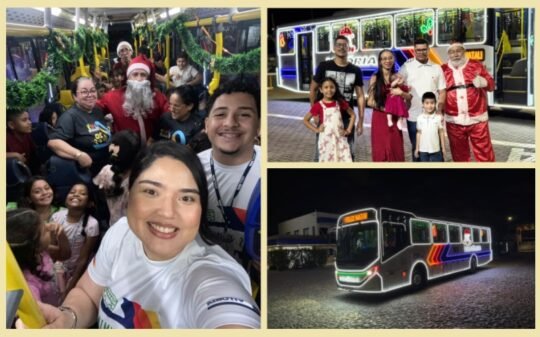 É que a Empresa Vitória agendou 41 passeios com ônibus iluminados, enfeites natalinos e Papais Noéis até o dia 23 de dezembro para colaboradores e seus familiares, estudantes e crianças de várias instituições de Caucaia.