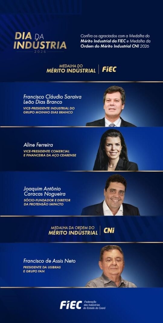 A Federação das Indústrias do Estado do Ceará (FIEC) e a Confederação Nacional da Indústria (CNI) divulgaram, nesta segunda-feira (9), os três agraciados com a Medalha do Mérito Industrial da FIEC e o agraciado com a Ordem do Mérito Industrial da CNI.