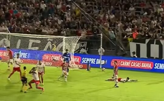 Bragantino queria a marcação de pênalti, no fim da partida. Foto: Reprodução Blogdoeliomar