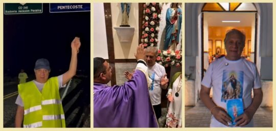 “Há exatamente 19 anos, fiz uma promessa a Nossa Senhora da Conceição, padroeira de Pentecoste-CE. Naquele momento difícil, entreguei minha causa nas mãos dela e, pela sua poderosa intercessão, alcancei a graça que tanto pedi. Com o coração transbordando de gratidão, cumpri o que prometi: após quatro dias de caminhada sob sol forte, chuva e muita fé, percorremos 83 km a pé até o seu santuário para agradecer o milagre que mudou a minha vida para sempre”, disse José Airton, sem revelar o milagre, tampouco a revelação feita pelo padre.