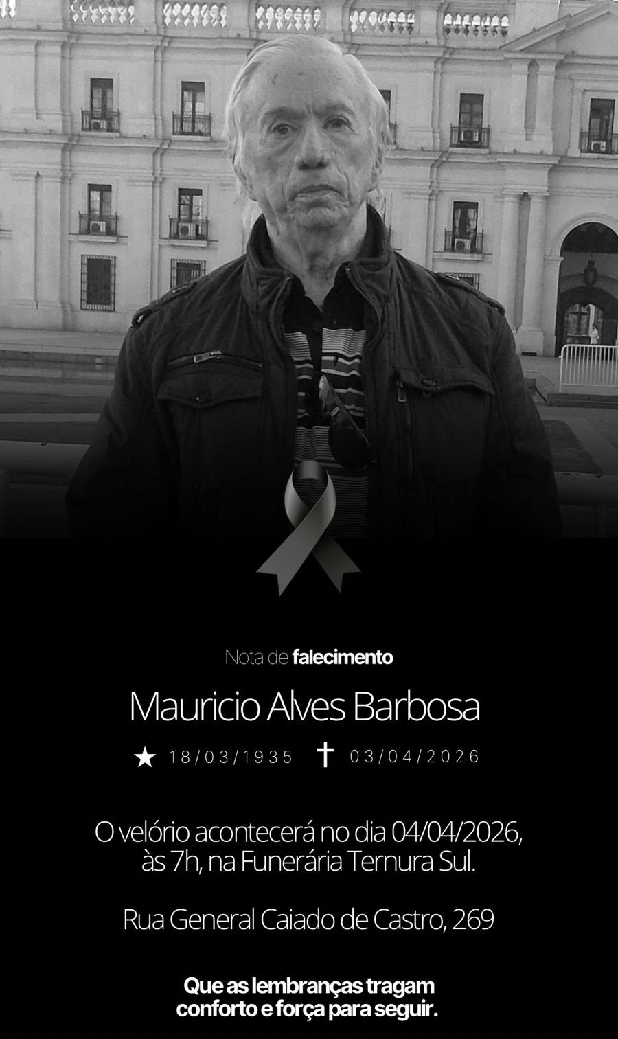 Morreu nesta sexta-feira (3) o auditor fiscal aposentado da Receita Federal e economista Maurício Alves Barbosa, 91. Ele é pai do sociólogo Luiz Cláudio Ferreira Barbosa e deixou outros quatro filhos.