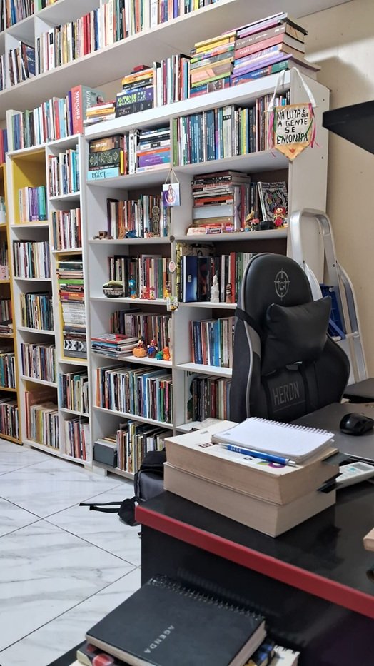 Aprendi com Bruno Paulino: “Peça licença, mas não deixe de entrar…” Sendo assim, pedi ao vencedor do Jabuti de 2018 e autor de dez obras para me mostrar o seu lugar de escrita. Vocês prestaram atenção na frase “Na luta é que a gente se encontra”? Foi a primeira coisa que eu vi. “Eu tenho um espaço que leio e guardo meus livros, mas não considero um “cantoooo” de escrita. Na verdade, da forma como minha escrita acontece, fujo de lugares fixos, a coisa acontece e vai”, explica Mailson Furtado. E foi mesmo, já que no meu Podcast Cafezim com Literatura ele conta que a primeira inspiração para escrever o premiado “À Cidade” foi olhando para um açude.