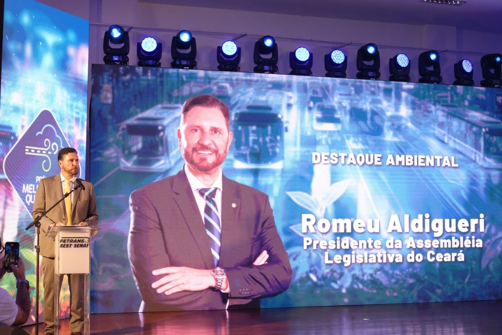 O presidente da Assembleia Legislativa, Romeu Aldigueri (PSB), ganhou homenagem, nessa noite de quarta-feira, durante a 22ª edição do Prêmio Melhoria da Qualidade do Ar (PMQA), evento anual promovido pela Federação das Empresas de Transportes de Passageiros do CE, PI e MA (Fetrans). Ele recebeu a comenda “Destaque Ambiental”.